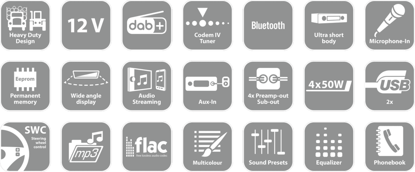 Le son est géré par un égaliseur semi-paramétrique 3 bandes, préréglages Rock, Pop et Classical, X-Bass, 4 sorties préamplifiées et 2 Sub-Out réglables. Son interface ergonomique et ses touches en caoutchouc facilitent l’utilisation même en conduite intensive.
